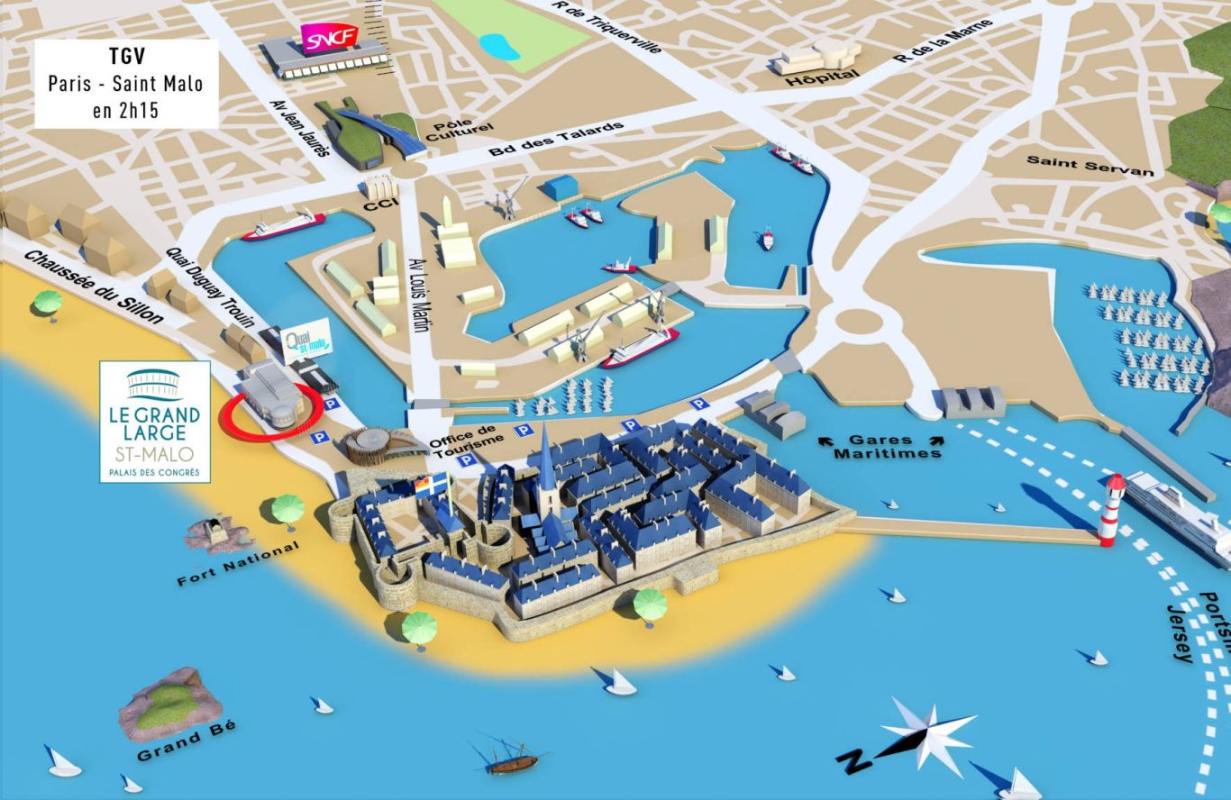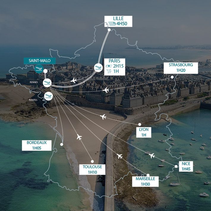 Saint-Malo se situe à 50 minutes de l'aéroport de Rennes, à 1 heure de Rennes en voiture, 2 heures de Nantes et 4 heures de Paris.